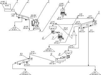 Продукт фракции более 40 мм (выход не более 5-10 %) возвращается с помощью конвейера на додрабливание в конусную дробилку. Из нее фракции щебня попадают на конусную гидравлическую дробилку (7) мелкого дробления через уравнительный бункер с вибропитателем (6). После чего продукт снова попадает на грохот (5), от куда фракции не более 20 мм поступают на уравнительный бункер с вибропитателе (8). Пройдя через бункер фракции щебня попадают на центробежную ударную дробилку (9), затем фракции не более 20 мм проходят классификацию на грохоте (10), где делятся в соответствии и размерами 5-20мм и 0-5мм и складируются в конусах.