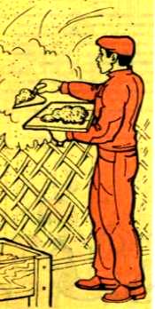 Підігрів матеріалів і приготування розчинів. У тому випадку, якщо розчини готують на місці робіт, всі матеріали (цемент, пісок та ін) не менш ніж за добу заносять у тепле приміщення. Змерзлих в грудки пісок застосовувати не можна. Заповнювач та хімічні добавки завантажують у растворосмеситель і перемішують 1,5-2 хвилини, після чого засипають цемент і продовжують перемішувати ще 2-3 хвилини. Воду і наповнювачі для приготування розчинів підігрівають з допомогою пари, гарячої води або електронагрівачів. Воду для приготування розчинів, що не містять гіпсове терпке, підігрівають до температури 90 ° С, для розчинів з гіпсовим в'яжучим - до 50 ° С. Розчини після перемішування в розчинозмішувачі повинні мати температуру, що не перевищує 50 ° С. У тому випадку, якщо температура що вводиться в розчин води недостатня або пісок має розмерзлись грудки, то підігрівають і пісок. Розчинні суміші з поташем підігрівати забороняється. Розчини з нітритом натрію і нітритом кальцію з сечовиною готують так само, як і розчини без хімічних добавок. Вся тара для подачі розчинів повинна бути утеплена, шланги укладені в короби, засипані теплоізоляційним матеріалом, або обгорнуті мінеральною ватою. Для приготування розчинів на об'єкті растворосмеситель, Розчинонасоси і компресор необхідно встановлювати в опалювальному приміщенні. Для збереження необхідної температури розчин транспортують на будівельні об'єкти в спеціально обладнаних автомашинах; на робочому місці його зберігають у утеплених або обігріваються ящиках з кришками. Використовувати відігрітися після замерзання розчин забороняється. В осінньо-зимовий період на будівельному об'єкті доцільно готувати штукатурні розчини із сухих розчинних сумішей і зачиняти їх водою температурою до 40 ° С. Готувати розчини з хімічними добавками дозволяється лише робітникам, які пройшли спеціальний курс навчання цьому виду робіт. До роботи з приготування водного розчину нітриту натрію допускаються робітники не молодше 18 років, що пройшли медичний огляд. Нітрат натрію зберігають у сухому приміщенні в дерев'яній тарі або в паперових мішках. Приймати їжу і курити у приміщеннях, де зберігається нітрат натрію, забороняється. Водний розчин нітриту натрію слід готувати в добре провітрюється. На баках з нітритом натрію має бути напис: «Обережно - отрута!» Для зовнішніх штукатурних робіт застосовують хлоровані штукатурні розчини (вапняно-цементні і цементні, зачинені хлорованою водою). Поставлений хлоровану воду шляхом розчинення хлорного вапна в підігрітою до 35 ° С воді, у 100 л води розчиняють 12-15 кг хлорного вапна. Розчин перемішують до повного розчинення вапна. Отримане хлорне молоко ставлять на 1-1,5 години для відстоювання, після чого отстой хлорованої води зливають у витратний бак, і використовують для приготування розчину.