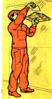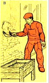 Для створення нормального температурного режиму будівлі утеплюють і опалюють в цілому або поверхове. У будівлі має функціонувати або постійне опалення, або регулярно діяти тимчасове калориферної. Штукатурні роботи дозволяється виконувати в зимовий час при стійкої середній температурі не нижче 8 ° С усередині приміщення біля зовнішніх стін на висоті 0,5 м від рівня підлоги. Для прискорення сушки штукатурки температуру в приміщенні рекомендується довести до 10-16 ° С. У той же час температура у стелі повинна бути не вище 30 ° С. Виробляти штукатурні роботи в приміщеннях з температурою нижче 8 ° С забороняється. Перед оштукатурюванням необхідно видалити з поверхонь полій, і потім приміщення добре обігріти. Обігрів і сушіння приміщень і штукатурки. Вапняних і вапняно-гіпсову штукатурку сушать в середньому 10-15 діб, провітрюючи приміщення два-три рази на годину. Цементної і цементно-вапняну штукатурки сушать протягом 6-7 діб, не провітрюючи приміщення, тому що в період їх твердіння потрібно вологе повітря. При великих обсягах штукатурних робіт для тимчасового опалення і сушіння штукатурки застосовують різні нагрівальні установки. Електрокалорифер ЕКМ-20 призначений для сушіння і обігріву приміщень на об'єктах, що будуються. Повітронагрівачі (рис. 53) (табл. 37) призначені для обігріву і сушки приміщень об'ємом 50-20000 м3. Особливістю конструкції цих повітронагрівачів є подача в робоче приміщення повітря без домішок димових газів. При експлуатації повітронагрівачів можна застосовувати різні види палива (солярове масло, тракторний гас, природний і зріджений гази) без переналагодження пальникового пристрою. Пальник інфрачервоного випромінювання ГК1-38 використовується для сушіння штукатурки в будинках за умови повітрообміну не менше двох разів на годину, працює від природного і скрапленого газу, відповідно, з витратою 2,36 і 0,9 м3/год з виділенням кількості теплоти 46 200 кДж / год. Висота пальники 1200-1900 мм, маса 11,5 кг. При малих обсягах штукатурних робіт найбільш економічні безугарниеобогревательние установки. Сушка приміщень відкритими жаровнями (мангалами) через небезпеку виникнення пожежі, і можливості отруєння чадним газом забороняється.