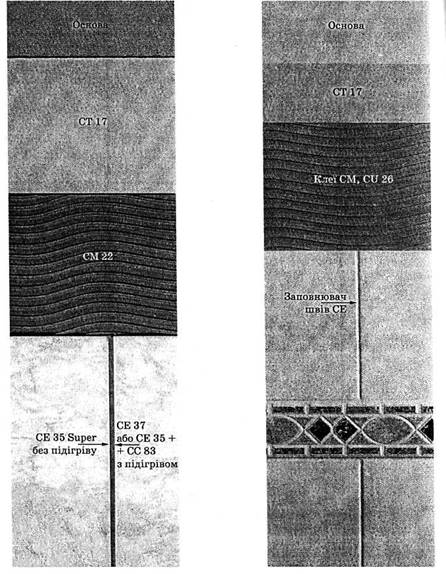Листи сухої штукатурки, гіпсові вироби штукатурки ( рис.2.8) При облицюванні основ з гіпсу або гіпсових виробів і конструкцій потрібно брати до уваги велику чутливість гіпсу до вологи Поверхня основи має бути стійкою і сухою, мати залишкову вологість меншу за 1% При облицюванні плитками листів сухої штукатурки їх мінімальна товщина має бути 12,5 мм На вологих ділянках застосовують спеціальні вологостійкі листи, до того ж їх слід пдроізолювати за допомогою двох і більше шарів ґрунтовки СТ 17 Плитки закріплюють клеєм CM 16, CM 22, CM 17 або CU 26. Шви заповнюють продуктом СЕ 33 Super, можна застосовувати СЕ 37 Еластичне ущільнення стиків виконують матеріалом CS 25