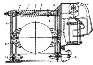 Устройство и принцип работы. Тормоз состоит из следующих основных частей: электрогидравлического толкателя 1, механической части. Механическая часть состоит из: опорной рамы 10, тормозной пружины в сборе с защитным кожухом 11 с таблицей тормозного момента, регулировочного болта пружины 3, верхнего рычага 2, тормозного и вспомогательного рычага 5, регулировочной тяги 4, тормозных колодок 6 с тормозными накладками 7, регулировочного болта колодки 8, регулировочного болта балансировки 9.