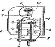 Пакет якоря склепан с двумя щеками 8, которые через ось 9 шарнирно соединены со стойками 10. В прорези щек установлена поперечная планка 7. Планка при повороте якоря упирается в шток тормоза и перемещает его, обеспечивая отход колодок тормоза от шкива и растормаживание механизма.