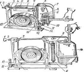 Расконтривают гайки 2, 6 и 7, находящиеся на тяге 1. Гайку 7 отвинчивают до тех пор, пока она не отожмет тягу от заднего рычага 13, а якорь электромагнита 9 не упрется в сердечник корпуса электромагнита 8.