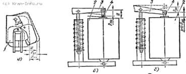 Вертикальные рычаги тормоза шарнирно соединены с основанием, а колодки шарнирно с этими рычагами. К верхнему концу рычага жестко прикреплена скоба, внутри которой расположены шток и пружина. На штоке, между скобой и концом рычага расположена вспомогательная пружина. Пружина, установленная между скобой и гайками, навинченными на шток, служит для замыкания тормоза, а вспомогательная пружина способствует отходу рычага с колодкой от тормозного шкива при растормаживании.
