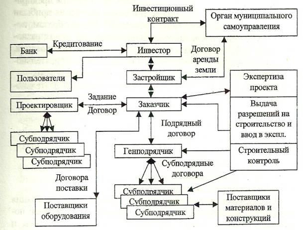 Варианты взаимоотношений в сфере строительной деятельности весьма разнообразны. Одна из возможных схем взаимоотношений участников строительства представлена на рисунке 1.