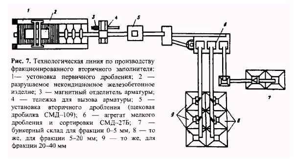 Перерабатывающая установка, включающая приемный бункер, дробильный агрегат, магнитный сепаратор и сортировочный узел. На крупных перерабатывающих предприятиях в состав установки входят также дробилка вторичного дробления, более полный набор грохотов, система воздушной сепарации легких частиц (остатки утеплителя, обоев, линолеума и др.), а иногда и установка для мойки вторичного щебня.
