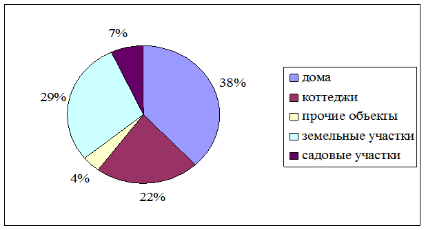Небольшую долю на рынке, около 7%, занимают садовые участки. Они находятся на территории коллективных садов, занимают около 5 – 8 соток. Самую большую долю на рынке (38%) составляют загородные дома. Средняя площадь загородного дома равна 65 – 70 м2 , размер прилегающего участка около 13 соток.