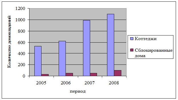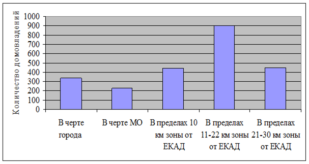 Максимальным спросом пользуются объекты малоэтажной жилой недвижимости, а также участки под индивидуальное жилищное строительство, расположенные в черте города или не далее 30 км от его границы. Одной из причин подобной ситуации на рынке является существование некого психологического барьера у потенциальных покупателей коттеджей в коттеджных поселках – далее 30 км от границы города готовы ехать далеко не все. (Рисунок 2.1 Приложение 7).