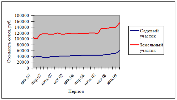 Рисунок 1.5 показывает динамику стоимости одной сотки земельных и садовых участков (Приложение 4).