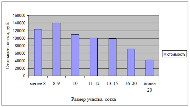 На рисунке 1.6 (Приложение 4) показано изменение одной сотки земли в зависимости от размера участка. Наиболее высокая стоимость наблюдается на участках размером 8-9 соток и на участках менее 8 соток.