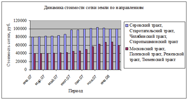 Екатеринбург является крупным автотранспортным узлом. В нескольких направлениях от города расходятся автомагистрали и дороги с твердым покрытием. Самые дорогие земельные участки находятся по Серовскому, Старотагильскому, Челябинскому и Старопышминскому трактам. Центрами притяжения Серовского и Старотагильского трактов, повышающими средний уровень цен, являются озера Таватуй и Балтым. Недорогие направления: Московский, Полевской, Режевской и Тюменский тракты (Рисунки 1.8, 1.9 Приложение 6). Таким образом, цены на земельные участки изменяются в зависимости от местоположения объекта. Рисунок 2.8 показывает изменение стоимости сотки земли по направлениям.