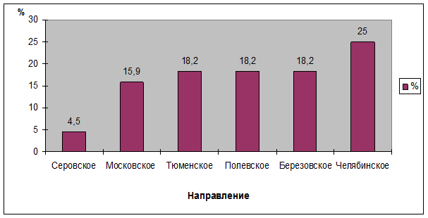 На рисунке 1.10 (Приложение 7) отражено процентное распределение коттеджных поселков по направлениям, на котором видно, что наиболее высокое предложение наблюдается в Челябинском (25%), Тюменском (18,2%), Полевское (18,2%), Березовское (18,2%) направлениях, а как же Московское направление (15,9%), Серовское направление (4.5%).