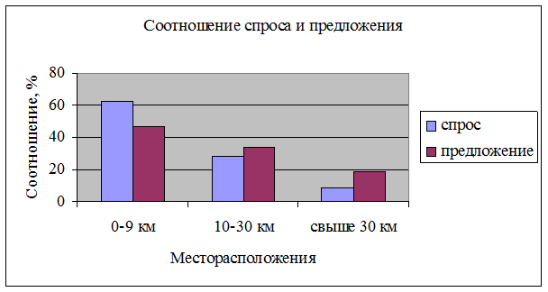 Рисунок 2.1 показывает соотношение спроса и предложения на рынке загородной недвижимости, в зависимости от месторасположения объекта.