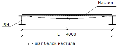 - Выбор толщины стального настила по рекомендациям в зависимости от нагрузки, вычисление расчетного пролета стального настила и назначение шага вспомогательных балок