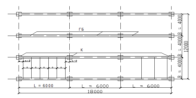 - сетка колонн состоит из 9-ти ячеек с размерами LxB, где L – шаг колонн в продольном направлении, B – шаг колонн в поперечном направлении;