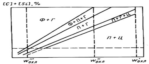 Влияние скорости охлаждения на структуру металла шва и околошовной зоны может быть охарактеризовано схемой, представленной на рис.1. В случае низких скоростей охлаждения в чугунном шве и участке околошовной зоны может быть обеспечено сохранение структуры серого чугуна.