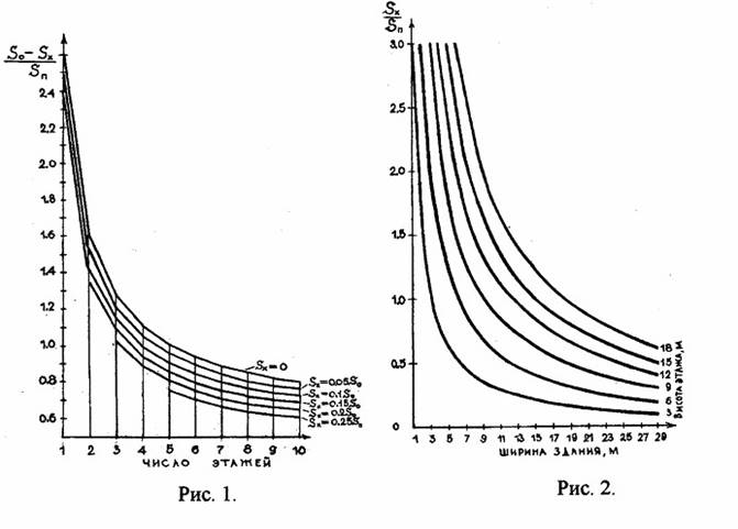 Для оценки тепловой эффективности энергоактивных участков введены обозначения площадей: участков Sх, общей наружных ограждений S0, суммарной полезной здания Sп. Тепловая эффективность участков выражена отношением (S0 - Sх)/ Sп. На рис. 1 показана зависимость этого отношения от этажности здания с учетом допущения, что коэффициент теплопередачи k всех наружных ограждений, в том числе конструкции пола, одинаков, за исключением энергоактивных участков ограждения, для которых тепловой баланс принят равным нулю (k=0). Величина упомянутого отношения, а следовательно, теплопотери здания снижаются как с увеличением площади Sх энергоактивных участков, так и особенно, с ростом этажности здания.