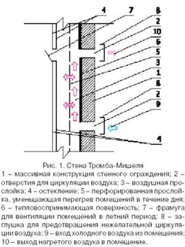 · комбинированные системы - например, стена-витраж, обеспечивающая нагрев внутренних ограждений помещения, выполненных в виде термических емкостей (в соответствующих климатических условиях позволяет получить до 17% требующейся энергии, или стена Тромбэ (см.прил. 2), провоцирующая сильный "парниковый эффект" в неширокой (до 16 см) воздушной прослойке между светопрозрачной наружной поверхностью и высоко теплоемкой стеной (при использовании в целях воздушного отопления и проветривания позволяет экономить около 55% энергии, а также остекленные атриумы, являющиеся квинтэссенцией пассивных средств использования энергии природной среды: энергетическая структура атриума, соединяющая свойства термических емкостей, буферного пространства, "солнечной трубы" и даже световода, определяет его значение как ключевого инструмента регулирования микроклиматических параметров здания, разумное использование которого позволяет обеспечить помещения качественной вентиляцией, естественным освещением (устройство атриума наиболее эффективно, когда предусматривается его использование для вентиляции, отопления и освещения) и при этом снизить теплопотери на 50 - 65%; с другой стороны, неоспоримые функциональные и эстетические качества атриумов сообщают им исключительную социальную значимость; остекленные атриумы, как пассивные системы, обладающие целым комплексом ценных энергетических свойств, стали наиболее характерным элементом сооружений, проектируемых в соответствии с принципами биоклиматической архитектуры.