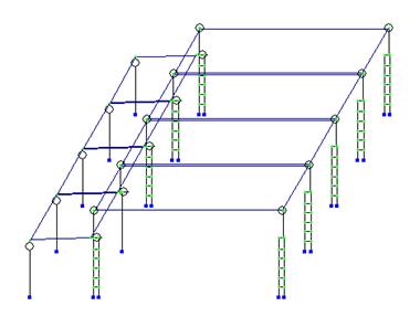 Моделируем в ПК “Лира" расчетную схему здания, сначала как плоскую регулярную раму (рис.3.1 4), а затем задаем жесткость элементам и путем копирования получаем пространственную модель (рис.3.1 5).