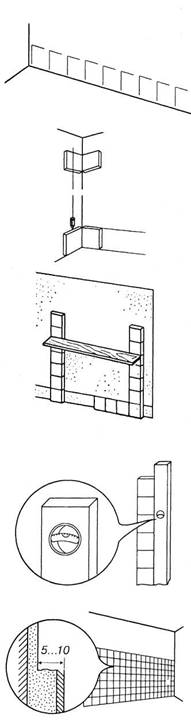 Якщо стіну вище облицювання будуть обштукатурювати, то для правильної установки карнизного (верхнього) ряду плиток треба, щоб облицьовувана панель на 5™ 10 мм виступала над площиною.