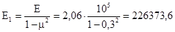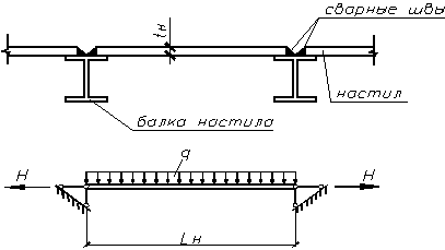 Сварные швы крепления настила к балкам не дают возможности его опорам сближаться при изгибе. Поэтому в настиле возникают растягивающие цепные усилия Н. Защемление настила сварными швами на опорах в запас не учитывают, считая опоры шарнирно-неподвижными. Изгиб настила происходит по цилиндрической поверхности. Цилиндрический модуль упругости стали определяется по формуле: