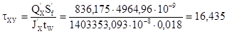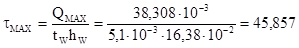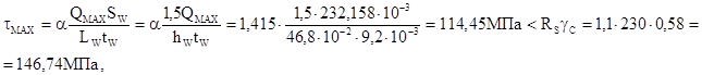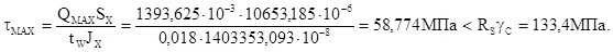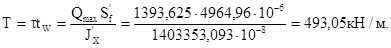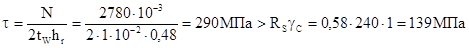 Так как стенка колонны тоньше примыкающих ребер (tw =10 мм< tr =25 мм), стенку проверяем на срез: