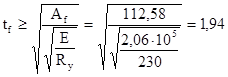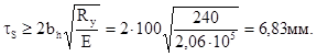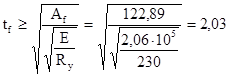 tПЛ = 25 мм (tПЛ =20…25 мм). Требуемая толщина парных ребер из условия работы на смятие: