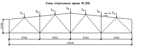 Высота трапецеидальной стропильной фермы на опоре h0 принимается 2200 мм при всех пролетах. Уклон кровли i = 1:12