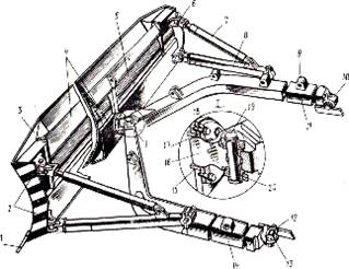 1 - ніж, 2, 9 - кронштейни, 3 - козирок, 4 - пояса твердості, 5 - відвал, 6 - хрестовина, 7 - розкіс, 8 - штовхач, 10 - запряжний шарнір, 11, 14 - напіврами, 12 - опора, 13 - кришка, 15 - гніздо, 16 - опора, 17 - болт. 18 - напівкришка, 19 - палець, 20 - змінна втулка