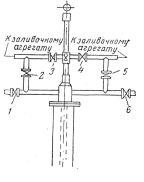 Раствор прокачивают в скважину через заливочные трубы при открытых задвижках 1, 3, 4 и 6 и закрытых задвижках 2 и 6. По нижним струнам заливочной головки через задвижки 1 и 6 жидкость из скважины выходит на поверхность.