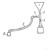 Цемент затворяют в чане 6, который устанавливают вблизи устья скважины. Приготовив цементный раствор, опускают в чан конец шланга с сеткой. После этого закрывают краны 2 и 3, заполняют при помощи ведер воронку 1 цементным раствором и затем открывают краны 2 и 3. Когда раствор из воронки опустится в заливочные трубы, быстро закрывают кран 2, одновременно открывая крап 4. Вследствие образования вакуума цементный раствор из чана через шланг начнет засасываться в заливочные трубы.