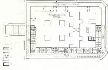 Рязань Успенский собор. Схема последовательности подводки фундаментов. 1 – линия шурфов;2 – участок ранней подводки фундаментов; 3 – проемы, закладываемые во время подводки фундаментов; 4 – участки подводки фундаментов.