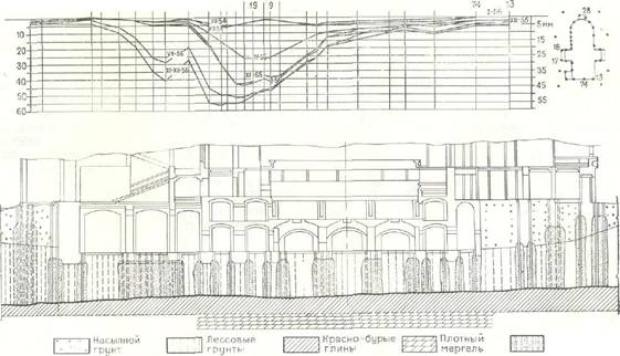 Одним из примеров значительных деформаций на таких грунтах и последующих мероприятий по их ликвидации может служитьОдесский оперный театр. Здание театра построено в 1887 г. архитекторами Ф. Фельнером и Г. Гельмером (рис. 107, 108). Театр имеет 5 ярусов и двухэтажный подвал. Высота здания 30 м, площадь 5000 м2 , объем 100 тыс. м3 . Основной несущий остов здания — каменные стены из кирпича и плотного известняка. Фундаменты здания ленточного типа из плотного известняка шириной от 2 до 0,6 м. В 1900 г. были обнаружены значительные неравномерные осадки: восточная сторона здания осела местами до 21 см, полы осели от 6,5 до 11 см. Некоторые стропильные фермы также значительно изменились. Экспертная комиссия рекомендовала исключить замачивание под фундаментами путем прокладки коммуникаций в проходных тоннелях. Это было выполнено, но осадки продолжались.