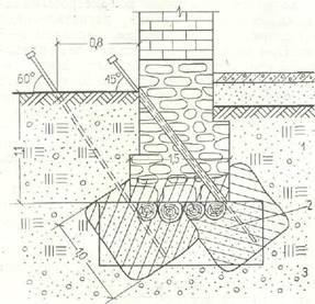 структуру. В эту структуру могут быть вовлечены и конструктивные элементы памятника: фундаменты и стены. На рис. показана схема установки корневидных свай, одновременно усиливающих стены, фундаменты и основания. За счет давления при подаче раствора в скважину происходит некоторое увеличение диаметра сваи (до 30—50%), неравномерное по ее длине, вследствие чего существенно увеличивается сцепление материала сваи с грунтом.