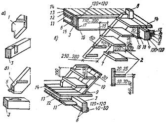 Рис. 4. Дощатая лестница: а, б – соединение наклонных досок (тетив) лестницы с балкой; в –сопряжение проступи с тетивой; 1 – лестничные тетивы; 2 – проступи; 3 – балка; 4 – поперечная балка; 5 – стальной угольник; 6 – рейка; 7 – клин; 8 – стойка; 9 – опорная рейка; 10 – доски; 11 – щит наката; 11 – слой глины; 13 – звукоизоляция; 14 – дощатый пол; 15 – потолок; 16 – рейка; 17 – штукатурка по дранке; 18 – нащельник