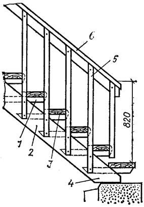 Рис. 6. Лестница со ступенями, прибитыми к брускам: 1 – брусок; 2 – тетива; 3 – проступь; 4 – стальной угольник; 5 – стойки ограждения! 6 – поручни ограждения