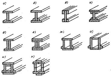 Рис. 8. Сечения несущих деревянных балок: а…е – двутавровые балки; ж…к – пустотелые балки