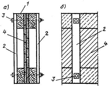 Рис. 9. Фрагменты гвоздевых балок из брусков и досок: а – поперечный разрез; б – вид спереди; 1 – брусок; 2 – ребро; 3 – болты с гайками и шайбами; 4 – дощатая стенка