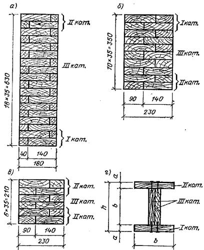 Рис. 10. Послойная укладка пиломатериалов в клееных конструкциях и их категории: а, б – сечение прямоугольных балок; в – сечение квадратной колонны; г – двутавровая балка, усиленная гвоздями