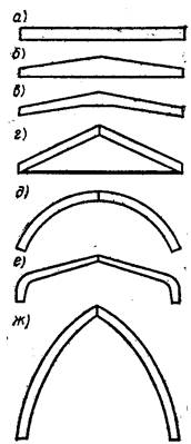 Рис. 11. Схемы деревянных клеевых несущих конструкций (вид спереди): а – прямоугольная балка; б – двускатная балка; в – гнутая балка; г – треугольная ферма со стальной затяжкой; д – деревянная шарнирная арка; е – гнутая рама; ж – деревянная параболическая арка