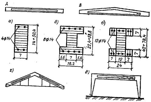 Рис. 12. Сечение армированных клееных деревянных балок: а – прямоугольной; б в – двутавровой; г – треугольная рама; д – прямоугольная рама