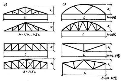 Рис. 13. Схемы фермы (вид спереди): а – деревянной; б – металлодеревянной