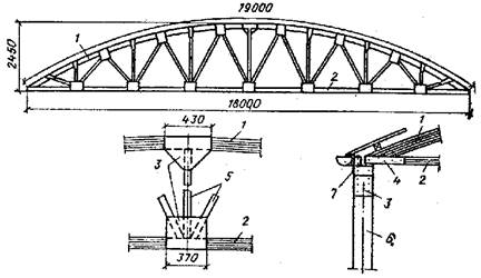 Рис. 14. Гнуто-клееные из досок дугообразные (сегментные) фермы со стальными пластинками для скрепления узлов: 1 – гнуто-клееный верхний пояс фермы из пяти слоев досок (22×83 мм); 2 – нижняя затяжка из четырех слоев досок (22×83 мм); 3 – фанерные пластинки толщиной 12,7 мм с двух сторон узлов фермы; 4 – накладки из листовой стали; 5 – элементы решетки – стойки и раскосы сечением 51×89 мм; б – опора фермы поперечным сечением 254×254 мм; 7 – стальные накладки