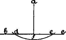 Еще один способ. Проведя линию bc и наметив точку от которой должен быть опущен перпендикуляр на прямую bc (в данном случае точка а), описывают приняв ее за центр, дугу радиуса такой длины, чтобы пересечь линию bc в двух пунктах; линию de, соединяющие точки пересечения, делят пополам, отмечают середину между точками d и e буквой f и, соединив эту последнюю точку с точкой а, получают исходный перпендикуляр (рис. 2).