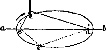 Овалы легче всего получаются следующим образом. Наметив положение овала определяют линию ав, которая разделяла его пополам по длине, и чертят ее на местности. На этой линии точно отмеряют крайние точки овала, от которых отмеряют равные расстояния до точек c и d, называемых фокусами овала. Чем ближе находятся эти точки к внешней линии овала, тем вытянутее получится сам овал; другими словами сближая и удаляя точки c и d, мы можем получить либо более скругленный, либо более вытянутый овал. В точках c и d вбивают два колышка; третий колышек вбивается в точке e, которая находилась бы приблизительно в самом удаленном пункте линии овала, если бы этот последний разделить пополам по ширине. На эти три кола надевается бичевка, в виде треугольника, которая могла бы свободно вращатся вокруг всех кольев. Вынув колышек e, описывают им в направлении стрелки линию овала, причем бичевка должна всегда быть под натяжением (рис. 4).