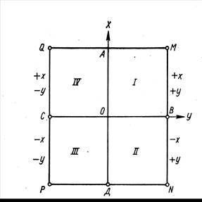 Положение любой точки на плоскости определяется координатами. Вместе с тем следует иметь в виду, что направление осей координат в геодезии иное, чем принятое в математике. За ось абсцисс Х в геодезии считается вертикальная линия, изображающая направление осевого меридиана в шестиградусной или трехградусной координатной зоне; за ось ординат Y принимается линия, перпендикулярная осевому меридиану. По такой же схеме изображается координатная сетка на планах и картах. На строительных площадках обычно принимается условная система координат, начало которых расположено в юго-западной части строительного объекта.