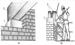 Рис. 11. Установка ригеля (прогона):а - вид опоры на стене, б- на столбе; 1 -железобетонная подушка, 2 - прогоны