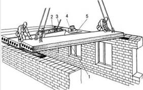 Рис. 12. Укладка плит перекрытия:1 - плита, 2 - ящик с раствором, 3 - лопата, 4 - ящик с инструментом, 5 - лом