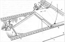 Другой способ заключается в том, что при нивелировании опорных поверхностей наносят отметки среднего монтажного горизонта на рейки, установленные по периметру здания через каждые 5…6 м. При этом исходят из того, что растворные швы должны быть наименьшей толщины. При монтаже плит натягивают шнур-причалку и по нему непосредственно под монтируемые плиты расстилают растворную постель таким образом, чтобы поверхность постели была на 2…3 мм выше шнура. Монтаж плит начинают от торцовых стен с инвентарных подмостей (столиков), а при укладке последующих плит монтажники находятся на ранее уложенных плитах.