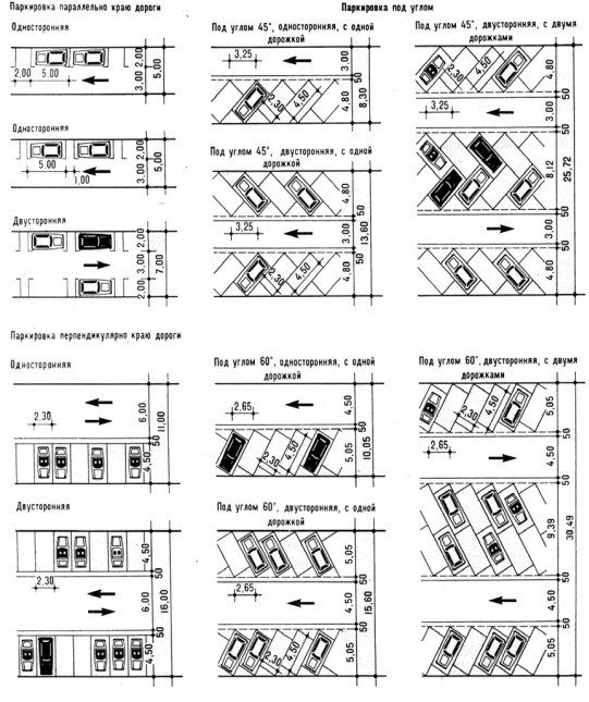 Ширина подъездного пути зависит от угла расстановки, способа въезда на стоянку (передним или задним ходом), расстояния между автомобилями, их габаритных размеров и маневренности.